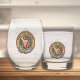 Clan MacFarlane crest badge surrounded by a strap and buckle over modern hunting tartan background. Custom text on both sides.