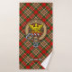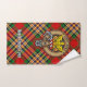 Clan MacGill crest badge surrounded by a strap and buckle over tartan background. Custom text on each towel.