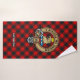 Clan Gregor or MacGregor crest badge surrounded by a strap and buckle over Rob Roy tartan background. Custom text on each towel.