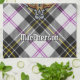Clan MacPherson crest badge surrounded by a strap and buckle over dress tartan background. Custom text.