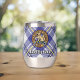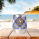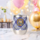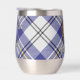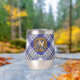Clan MacPherson crête badge entouré d'une sangle et boucle sur la robe bleue arrière - plan tartan. Texte personnalisé des deux côtés.