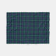 Fleece blanket with the Clan MacThomas tartan, a traditional Scottish plaid pattern in royal blue, black, and green with bright purple and lavender accents. Choose from three sizes.