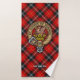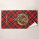 Clan Marjoribanks crest badge surrounded by a strap and buckle over tartan background. Custom text on each towel.