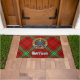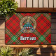 Clan Morrison crest badge surrounded by a strap and buckle over red tartan background. Custom text.