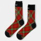 Clan Morrison crest badge surrounded by a strap and buckle over red tartan background. Custom top stripe colour. Custom text on each sock.