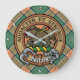Clan Pollock crest badge surrounded by a strap and buckle over tartan background. Custom text.
