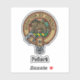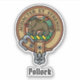 Clan Pollock crest badge surrounded by a strap and buckle over tartan background. Custom text.