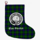 Holiday stocking with Scottish Clan Sinclair crest badge and customizable text on tartan background