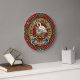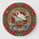 Clan Stewart crest badge surrounded by a strap and buckle over Royal tartan background. Custom text.