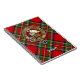 Clan Stewart crest badge surrounded by a strap and buckle over Royal tartan background. Custom text.