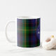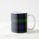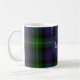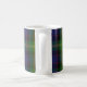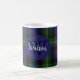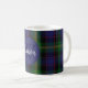 Monogrammed coffee mug done in a traditional and colourful Scottish clan Watson tartan plaid pattern. A blue circle has a monogram and family name. Personalize the monogram and name to suit your needs.