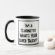 Funny slogan on a Two Tone Coffee mug that says "I'm a Clarinetist. What's YOUR super talent?". Two Tone Coffee Mug for a Clarinetist or someone who plays the clarinet. Black and white bold text.