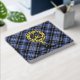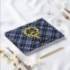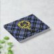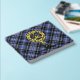Clan Clark crest badge surrounded by a strap and buckle over tartan background. Custom front, back and spine text.