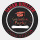 Modern, faux glitter red and black Class of 2018 graduation party stickers- Black circular frame with faux metallic, silver rim displays faux glitter, red graduation cap with diploma/degree. Reads 'Graduation Party' with scattered stars that looks like sparkly, matching red glitter. Personalized with graduate's name in matching red, retro style letters at the top and curved 'Class of 2018' below in matching red. (Class year may be changed.) Chic, modern graduation design to go with any red graduation party theme or decor. We have coordinating red glitter graduation party invitations, as well as other girly glitter graduation party supplies and personalized party themes in our Zazzle.com/angela65* shop. Simple, chic personalized graduation party style for red and black school colours, girly glitter graduation party envelope seals, or red and black graduation party favours. Click Customize option to change text colours, size, and font styles.