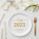 Stylish elegant custom graduation party supply! Celebrate the graduate's accomplishment in style with this trendy graduation paper plates. Design features "Class of 2023" in gold font on a clean white background. Personalize this product by adding the name and school name. Easy to customize. Matching graduation party supplies available. Congratulations!