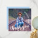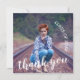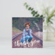 This square graduation thank you card features a custom photo frame that fills the front. Curved text, on the right side, reads: Class of 20XX and can be changed to any year. The back offers a graphic of a mortarboard and custom text for you to add a personal thank you message and your name.