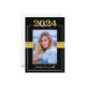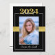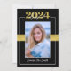 This black & gold Class of 2024 graduation invitation can be customized to invite to commencement exercises and/or a graduation party in honour of the graduate. This would work well for male or female graduates. The front features a portrait of the graduating student prominently placed with the 'class of 2024' above the photograph and the grad's name beneath. There is also a faux ribbon across the middle behind the picture. The back contains all the information required to attend the festivities. A black line and the 'class of 2024' are along the bottom edge. This invitation would work well for high school and college/university graduations.