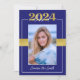 This blue & gold Class of 2024 graduation invitation can be customized to invite to commencement exercises and/or a graduation party in honour of the graduate. This would work well for male or female graduates. The front features a portrait of the graduating student prominently placed with the 'class of 2024' above the photograph and the grad's name beneath. There is also a faux ribbon across the middle behind the picture. The back contains all the information required to attend the festivities. A blue line and the 'class of 2024' are along the bottom edge. This invitation would work well for high school and college/university graduations.