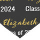 The table runner is black. It has a text pattern for the graduate's name and Class of 2024. The name (Shown: Elizabeth) appears in an elegant faux (not foil) gold script. The other text is white. All of the text can be edited.