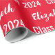 The wrapping paper is bright red. It has a text pattern for the graduate's name and Class of 2024. The name (Shown: Elizabeth) appears in an elegant white script. The other text is also white. All of the text can be edited.