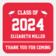These bright red and white graduation favour stickers say 'Class of 2024' in large white text. (You can change the year if necessary.) At the bottom, there's white display text you can change to show the correct name for the graduate. White graduate's caps are on either side of the phrase "Class Of". You can also edit the custom message for your guests. (Shown: Thank You For Coming)