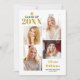Class of 2025 gold and white graduation cap party invitation. It showcases our photos, your text in gold on white background and a graduation cap. The back includes the details of the party in a frame with a pattern border made of graduation caps.
