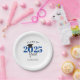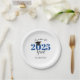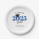 This personalized paper plate is perfect for your graduation party. The blue and black text reads: Class of 2025 Grad. A black mortarboard sits on top of the zero in the year.