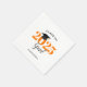 This graduation napkin features a modern design in orange and black and custom text for the name of the graduate. The text reads: Class of 2025 Grad. The design is accented with a black graduation hat.
