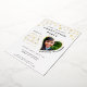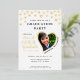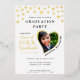 Create unique white and gold photo graduation invitations for the class of 2025 graduate decorated with golden hearts. Real gold foil is on the front side of the cards. Templates make it easy to personalize the invites with your data and upload a photo. Name and Family Name should be changed separately to have this stylish curved view. Please use the template to upload your photo to have the same heart-shaped image of the graduate. Try a few photos to choose which one suits best for a heart-shaped image.