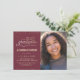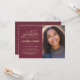 This elegant and festive 4.5" x 6.25" Photo Graduation Party Invitation features gold (simulated foil) confetti with the words "Class of 2025 Graduate" showing in a gold script font. There is a custom photo area for your picture of the graduate. The background is maroon, but can be changed to any colour of your choice. The celebration details can be easily customized for your special event (such as name of high school). The back of the card features a gold dotted pattern, also with a maroonbackground that you can customize to your liking. A beautiful and simple way to invite guests to celebrate a graduation.