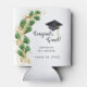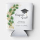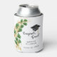 Create a unique can cooler for a graduation party with the design that features a Congrats Grad saying, and is decorated with a graduate's cap and elegant emerald green and gold eucalyptus greenery on a white background. The template makes it easy to type the graduate's name and year.
