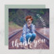 This square graduation thank you card features a custom photo frame that fills the front. Curved text, on the right side, reads: Class of 20XX and can be changed to any year. The back offers custom text for you to add a personal thank you message and your name on a light sage green background.