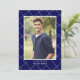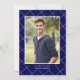 This classic yet modern graduation invitation features a sophisticated design with a navy blue background adorned with a white diamond pattern. The front of the invitation showcases a customizable photo template, framed by the stylish pattern. Below the photo, the graduation year can easily be changed to suit any graduating class, followed by the customizable name of the graduate. The back of this contemporary invitation continues the same navy blue and white diamond pattern, with the event details such as the graduate's name, date, time, location, and RSVP contact information presented on a solid blue background. The text on both the front and back is in a mix of grey or silver and white, providing a clean and modern look. Simply click "Personalize this template" to easily change or remove any of the sample text. This invitation is perfect for graduates looking to announce their achievement in a classy and personalized manner. The customizable template allows for easy personalization, making it suitable for any graduate's celebration. Its minimalist yet classic design makes it a versatile choice for both male and female graduates, ensuring a timeless and elegant announcement.