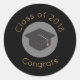 A sticker which says Class of 20xx Congrats. Designed with a black graduation cap surrounded by a semi-transparent white circle. Black background with gold lettering is simple yet stylish.