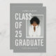Your graduate's photo, surrounded by large bold lettering "CLASS OF 25 GRADUATE", finished with your name and high school. On the back, you can share a story or the graduate's bio of interests and activities, or delete the text and leave blank. Add your own photo and other details by following the "Personalize" link. The black and white school colours can also be changed, to match your graduate's school colours, by using the edit menu. If you would like assistance, please feel free to reach out to me via email at susanmingaydesigns@gmail.com