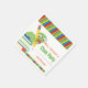 This class party paper napkin features a cute bookworm sitting on top of a stack of books. The napkin is accented with multicolored stripes on the top and bottom. Customizable text allows you to add: teacher's name and grade.