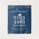 Welcome alumni to their high school or college class reunion (editable for any year reunion) with this custom colour tapestry to be used as a sign or photo op backdrop featuring gold stars, string lights, calligraphy script and decorative typography and personalized with your school name and graduating class year. The colours (shown in blue, gold and white) can be changed to your school colours or coordinating party theme colours in EDIT. TAPESTRY OPTIONS: The sample is shown in the 50x60" size--other sizes are available on the ordering page. ASSISTANCE: For help with design modification or personalization, colour change, resizing or transferring the design to another product, contact the designer BEFORE ORDERING via the Zazzle Chat MESSAGE tab below or email makeitaboutyoustore@gmail.com.