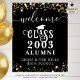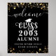 Welcome alumni to their high school or college class reunion (editable for any year reunion) with this custom colour (shown in black, gold and white) poster sign featuring gold stars, string lights, handwritten script and decorative typography and personalized with your school name and graduating class year. The colours can be changed to your school colours or coordinating party theme colours. OPTIONS:  The sample is shown in a 22x28" size on Value Paper (Matte)--other sizes and paper quality or canvas, Digital Download file for local printing or to transfer the design to another product like a foam board, banner, tapestry, etc. are available on the ordering page. RESIZING TIP:  Use the CHOOSE YOUR SIZE section below "Standard Sizes" if uneven borders occur and click the UNLOCK icon first (looks like a chain link) before entering the new width and height dimensions. Adjust the new dimensions proportionately by adding or subtracting approximately the same number of inches on both from the original size (you may have to adjust incrementally to achieve equal outside borders). ASSISTANCE:  For help with design modification or personalization, colour change, resizing, transferring the design to another product or converting to a Download file, contact the designer BEFORE ORDERING via the Zazzle Chat MESSAGE tab below or email makeitaboutyoustore@gmail.com.