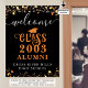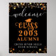 Welcome alumni to their high school or college class reunion (editable for any year reunion) with this custom colour poster sign featuring gold stars, string lights, handwritten script and decorative typography and personalized with your school name and graduating class year in your choice of colours (shown with white and orange text and graphics on an editable black background). The colours can be changed to your school colours or coordinating party theme colours. POSTER PRINT OPTIONS: The sample is shown in an 18x24" size--other sizes are available or the design can be transferred to a foamboard, banner, tapestry backdrop or downloaded as a digital file for local printing on the ordering page. ASSISTANCE: For help with design modification or personalization, colour change, resizing, transferring the design to another product or converting to a Download file, contact the designer BEFORE ORDERING via the Zazzle Chat MESSAGE tab below or email makeitaboutyoustore@gmail.com.