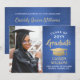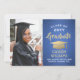 Announce a high school or college graduation and invite family and friends to celebrate with custom photo royal blue and gold party invitations. The picture and wording are simple to personalize and the colours are easy to change with the Zazzle design tool. This template is set up as a combination announcement card and party invitation that can be customized with any details of your choice, such as parents' names, special honours, degree title, favourite inspirational quote, graduate's future plans or new address. The design features a faux brushed metallic background, a faux foil mortar board cap, elegant modern calligraphy, classic vintage typography and one favourite photo, such as a senior picture or an image from the commencement ceremony. Please note that gold is printed colour, not metallic foil. This graduation card is a stylish way to announce a special day celebration. Congratulations to the graduate!