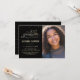 Cet élégant et festif 4,5" x 6,25" Photo Graduation Party Invitation présente un confetti d'or (feuille simulée) avec les mots "Classe de 2025 Graduate" montrant dans une police de script d'or. Il y a une zone photo personnalisée pour votre photo du diplômé. L'arrière - plan est noir, mais peut être changé à n'importe quelle couleur de votre choix. Les détails de la célébration peuvent être facilement customisés pour votre événement spécial (comme le nom de l'école secondaire). Le dos de la carte est muni d'un motif pointillé doré, également avec un arrière - plan noir que vous pouvez customiser à votre goût. Une façon simple et belle pour les invités invitations de célébrer un diplôme.