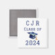 Personnalisez les trois initiales et l'année de graduation dans cette catégorie d'aimant 2024. Texte bleu, arrière - plan blanc, bouchon de graduation bleu avec goût or. Ces magnets sont parfaits pour un cadeau de remise de diplômes customisé et les faveurs de la fête en l'honneur du diplômé.
