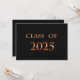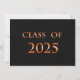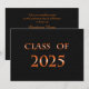 Classe de carte 2025 avec texture noire pour l'arrière - plan et orange pour le nom. Le dos est une texture noire avec des lettres orange pour les annonces de graduation.