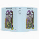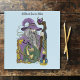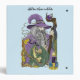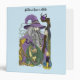 Un sorcier tout en violet tenant un bâton qui a une boule de cristal violet. Un petit dragon vert, un noeud celtique, une bougie et une bordure d'automne feuilles le tout dans un décor bleu clair