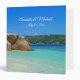 Un album de mariage avec une photo d'une plage bleu turquoise de l'océan avec de gros rochers éparpillés le long de la côte. Région tropicale claire et ensoleillée.