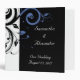 Invitations contemporaines contemporaines audacieuses et saisissantes à mariage noir avec des accents bleu cornflower blanc et périwinkle, avec délicat arrière - plan de feuille de rouleau tourbillon. Customisez en ligne avec vos coordonnées de mariage.