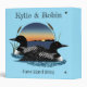 Une paire de huards sur le lac avec un coucher de soleil chaud derrière eux, le tout dans un décor bleu