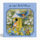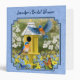 Une paire de bleuets de l'est font leur maison dans une mignonne maison d'oiseaux jaunes dans un beau jardin de printemps rempli de marguerites bleues et jaunes et entouré de bois de chien en fleurs. Des papillons orange et bleus viennent également visiter les fleurs. Le tout sur un arrière - plan à motifs bleus assorti.