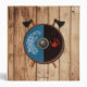 Rauð hönd ok örn. Un bouclier Viking et des haches de bataille croisées superposées sur une image arrière - plan murale en planches de bois. Le bouclier est noir sur le côté gauche avec une empreinte rouge à droite. L'autre côté du bouclier est bleu avec un aigle blanc de style celtique-norse. Il y a deux endroits où vous pouvez customiser ce produit en ajoutant votre propre texte sur le devant, et un autre sur la colonne vertébrale. Les boucliers viking variaient. J'ai basé cela sur des exemples historiques. Les boucliers étaient parfois recouverts de cuir, comme celui-ci. Par conséquent, la peinture est imparfaite permettant de voir une pointe de cuir sous-jacent. Les bords en fer étaient rares; j'ai opté pour le revêtement en cuir comme on l'utilisait souvent. J'ai opté pour de simples têtes de hache au lieu de la hache de barbe et des interprétations plus fantaisistes qui sont couramment employés par les artistes.
