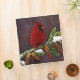 Une belle image d'un cardinal masculin brillamment rouge sur une neige a épousseté la branche de pin complète avec des pinecones.